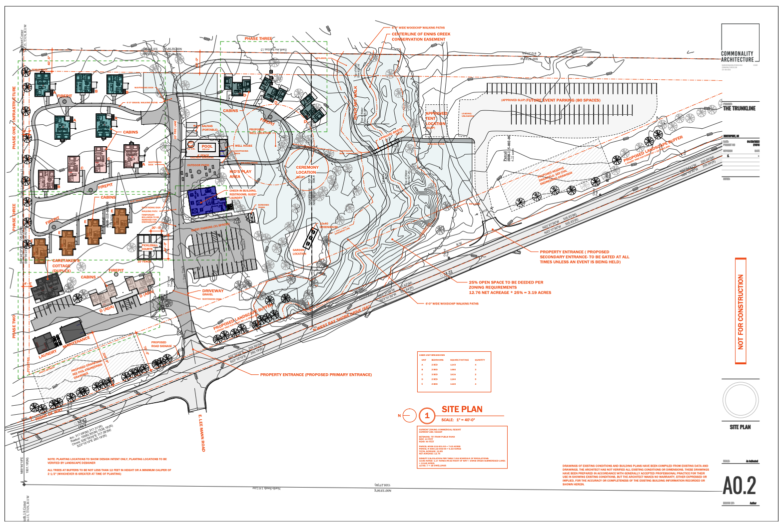 We've got 14 acres to work with, and took the time to lay things out juuuust right. Commonality Architecture helped us fit it all in; 18 cottages, a check-in lodge, employee housing, event areas, and lots of open space.